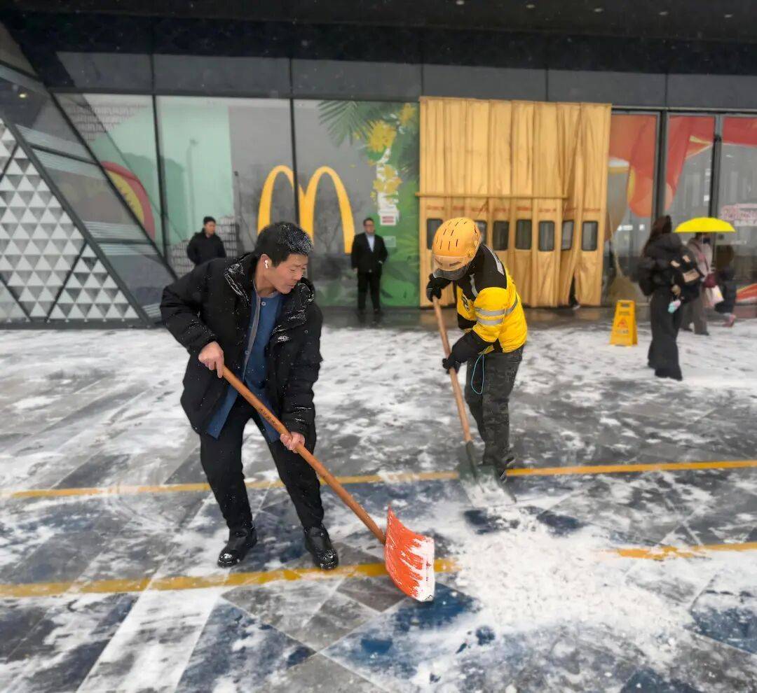组织人员清扫积雪、铲除结冰。多名快递小哥也主动加入清雪队伍,承担重点区域的清扫工作,并提醒往来居民注意安全。此举不仅保障了居民出行安全,也拉近了“两新”群体与社区商圈的距离,进一步推动新就业群体由“旁观者”向“参与者”转变,为基层治理格局注入了新力量。