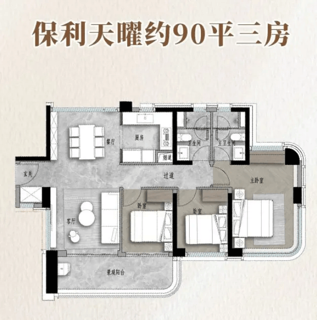 建面约90㎡三房户型:紧凑实用,动静分区合理,南向阳台和主卧飘窗保证了充足的采光和通风。两梯四户的配置,让日常出行不拥挤,非常适合刚需家庭入手。