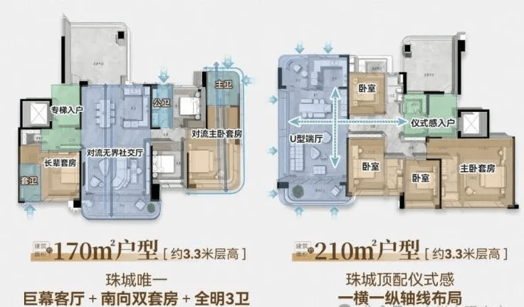 建面约170-220㎡四房户型:空间开阔,部分户型能俯瞰珠江,尽享江景美景。两梯两户的设计带来极致的私密体验,同时配备全套“七衡系统”,居住体验更佳。南地块作为珠江新城东区近十年来首个两梯两户的低密板楼社区,让业主尽享高端居住品质。