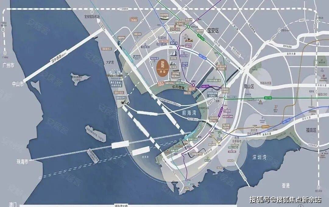 陆:亚州最大交通枢纽——前海综合交通枢纽、妈湾跨海大道、广深沿江高速、深惠城际铁路(在建)、深港西部快轨、深中通道(在建)、滨海大道、穗深城际线、深珠城际线、深茂铁路深圳段