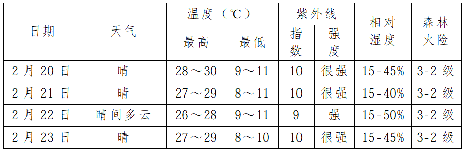 2.春节我市气温较高,午后至傍晚风力增大,空气干燥,需加强森林火灾防范。